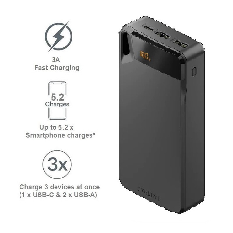Cygnett ChargeUp Boost 4th Gen 20K mAh Power Bank- Black(CY4751PBCHE)Triple Port(Dual USB-A 15W 1xUSB-C 15W),15cm USB-C Cable