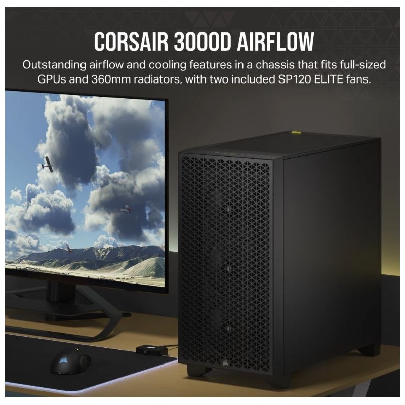 Corsair 3000D AIRFLOW Mid-Tower PC Case - Black, ATX, 360mm GPU, 170mm CPU cooler, 220mm PSU, 360mm rad, 2x SP120, 2x USB-C 3.2 Gen 1