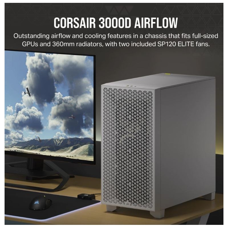 Corsair 3000D AIRFLOW Mid-Tower PC Case - White, ATX, 360mm GPU, 170mm CPU cooler, 220mm PSU, 360mm rad, 2x SP120, 2x USB-C 3.2 Gen 1