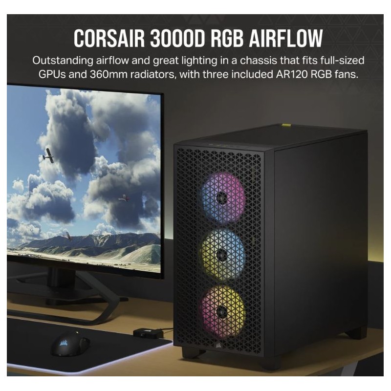 Corsair 3000D RGB AIRFLOW Mid-Tower PC Case - Black, ATX, 360 GPU, 170 CPU cooler, 220 PSU, 3x AR120 RGB, 2x USB-A 3.2 Gen 1