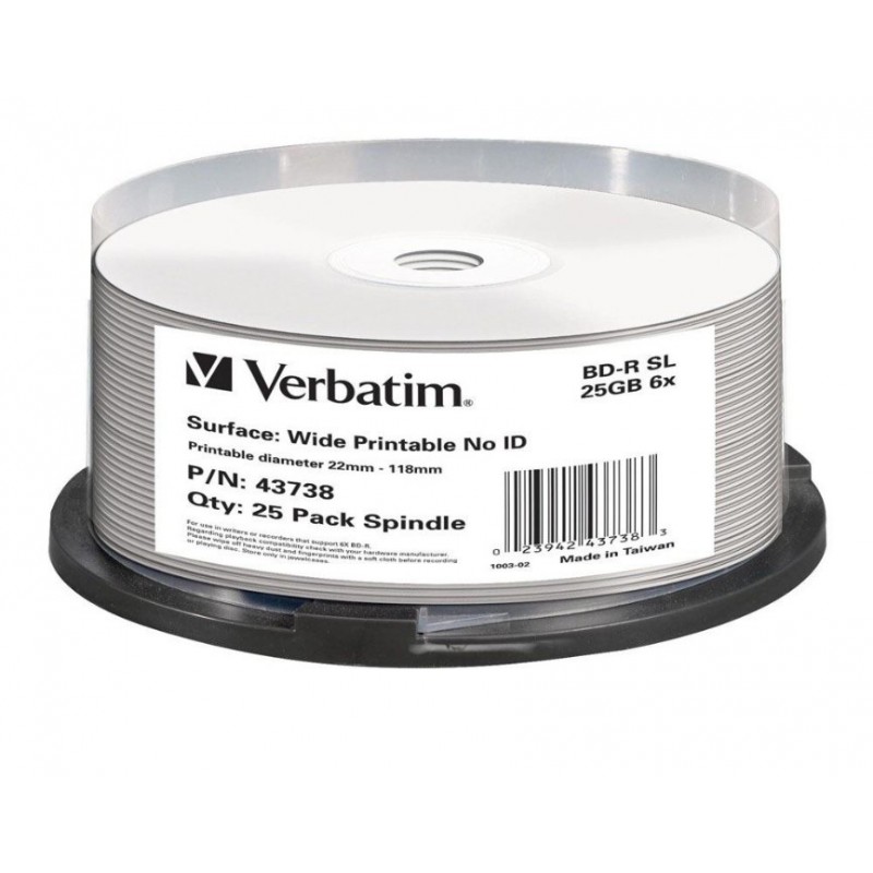 Create high quality, customised labels for your BD-R media with Verbatim White Inkjet Printable Blu-Ray Recordable discs. These discs have been extensively tested for compatibility with inkjet disc printers from Primera, Microboards, Epson and others. With a storage capacity of 25GB, these are one-time record discs, ensuring that your video, music or other information will not be erased. All Verbatim BD-R media features HardCoat™ to protect against scratches, fingerprints and dust build-up, reducing playback and recording errors. BD-R discs are ideal for recording HDTV programs or backing up your music collection.