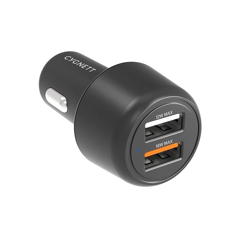 Cygnett CarPower 30W Dual Port Car Charger - Black (CY3680CYCCH), 2xUSB-A(12W & 18W QC 3.0), 3.6x faster than standard 5W, 2