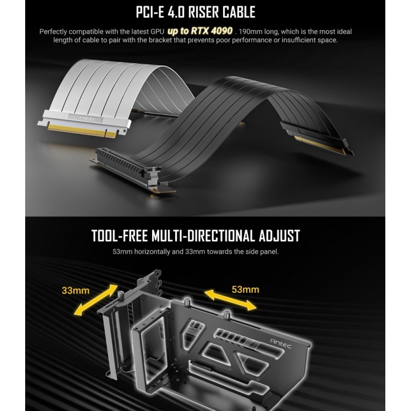 Antec Adjustable Vertical GPU Bracket and PCI-E 4.0 Riser Cable Kit (190mm) White x16 Speed, Gold Plated extreme stability &