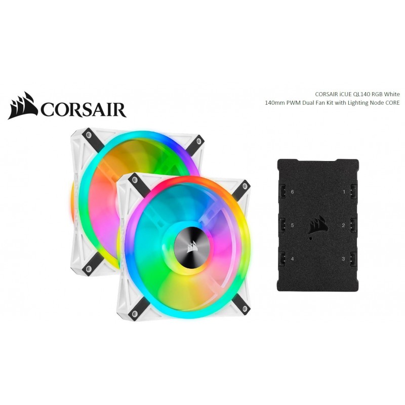 Corsair QL140 RGB White Dual Fan Kit with Lighting Node Core, ICUE, 140mm RGB LED PWM Fan 26dBA, 50.2 CFM, 2 Fan Pack