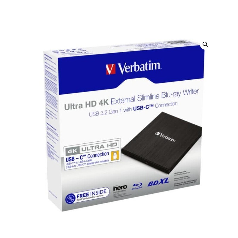 Verbatim External Slim Blue-ray Writer Ultra HD 4K Type-C Connection, USB 3.1 Gen1. Includes Nero Burning Software. Ultra Por