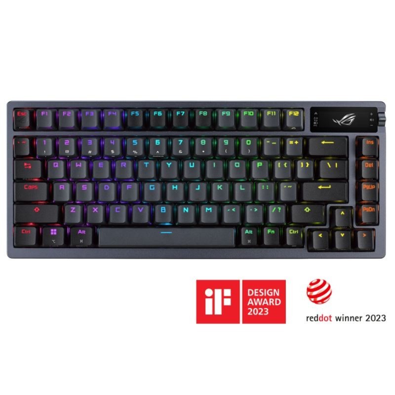 ROG Azoth gaming custom keyboard with 75 keyboard form factor, gasket mount, three-layer dampening foam and metal top cover, highly customizable with hot-swappable pre-lubed ROG NX mechanical switches, ROG keyboard stabilizers, PBT doubleshot keycaps and lube kit, tri-mode connection with 2.4 GHz SpeedNova technology, OLED display, three-way control knob, three tilt angles, and Mac support