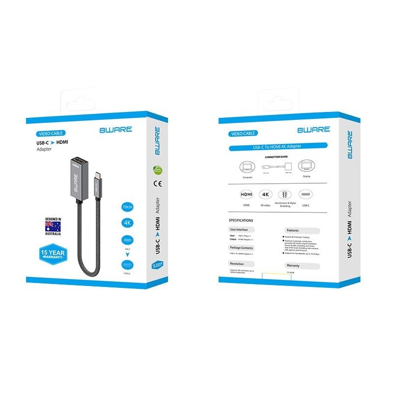8ware 10cm USB-C to HDMI Male-Female Adapter Converter Cable Retail Pack for PC Laptop iPad MacBook Pro/Air Surface Dell XPS