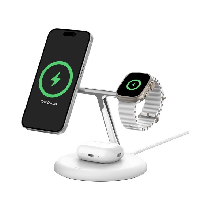 Belkin BoostCharge Pro 3-in-1 Magnetic Qi2 Wireless Charging Stand + 36W Wall Charger + USB-C Cable - White(WIZ023AUWH)