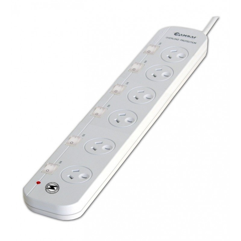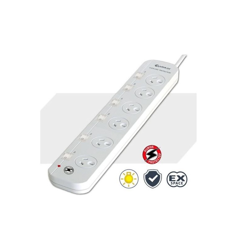 - 6 x Standard 10A, 240V Power Outlets with SURGE Protection - 3 of the standard 10A Outlets have Extra Space Sockets - Individual Switches - Overload Protection - Reset Button & Indicator Light - 1 metre Main Cord
