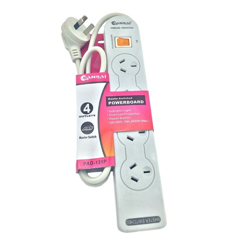 Sansai 4 Way Basic Powerboard (131P) with Master Switch Overload Protecte Reset button Indicator Light 100CM Lead 240VAC 10A