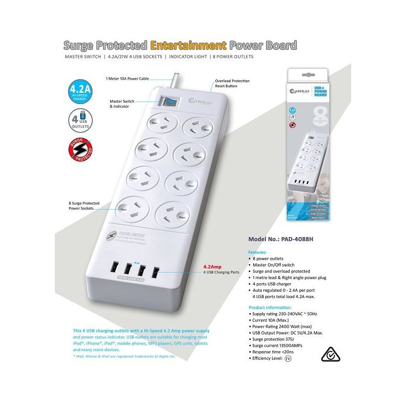 Sansai 8 Outlets & 4 USB Outlets Surge Protected Powerboard Master On/Off switch 1M lead & Right angle plug 230-240VAC IV Ret