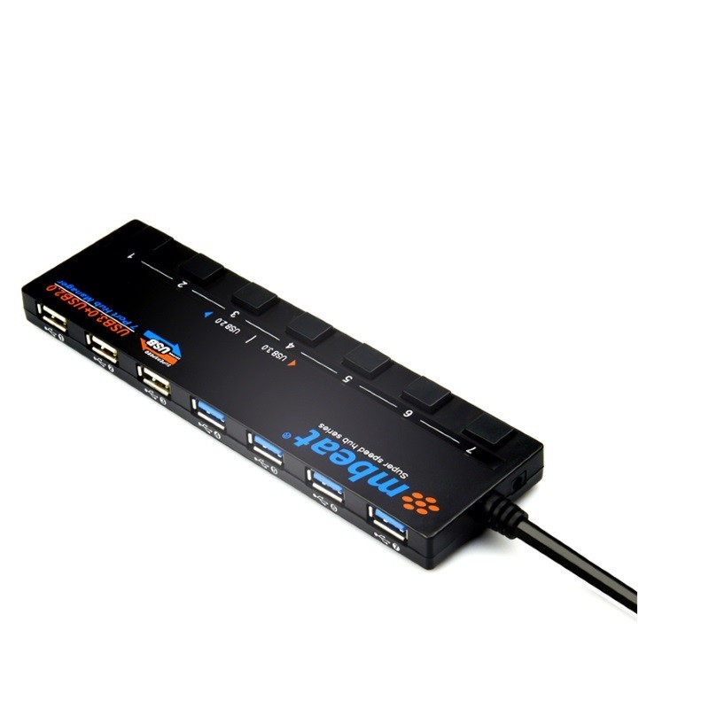 mbeat presents the first 7 port super speed hub manager that combines today's super speed USB 3.0 and USB 2.0 technology together, simultaneously supporting both USB 3.0 and USB 2.0 powered devices. This 7 port hub features 4 x USB 3.0 ports with data transfer rate up to 5 Gbps and 3 x USB 2.0 ports, providing a data transfer rate up to 480 Mbps for USB 2.0 devices. The mbeat 7 port super speed hub manager has a stylish black slimline design with individual power switch to switch on/off the plugged in devices. The separated and clearly marked USB 3.0 and USB 2.0 ports make sure that your USB 3.0 device and USB 2.0 devices find the right port, and keeps your desk looking organised.