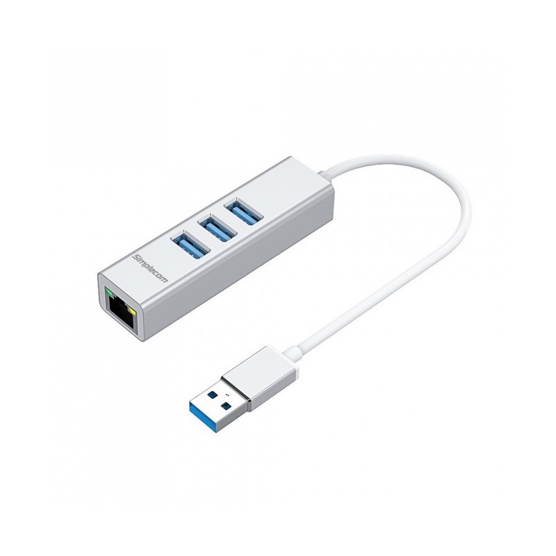 Simplecom CHN420 Silver Aluminium 3 Port SuperSpeed USB HUB with Gigabit Ethernet Adapter