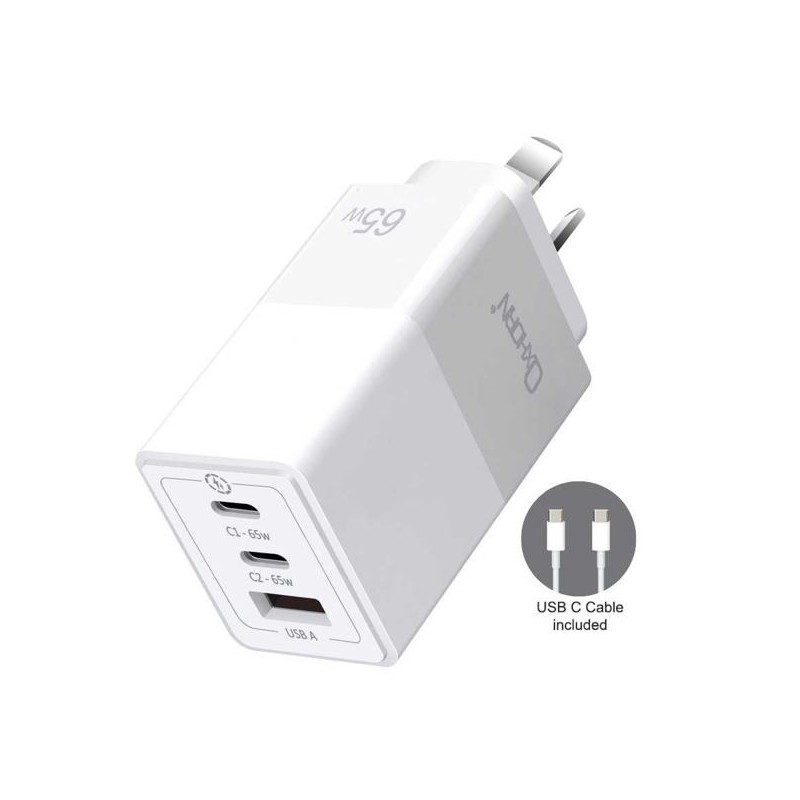 Oxhorn 65W GaN Type C fast Charger 3 Port 2xUSB-C 1xUSB-A PD3.0 QC4.0 PPS AUS Approved C-tick White with cable