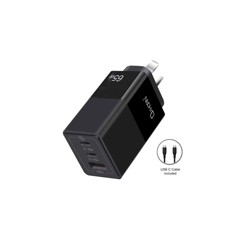 Oxhorn 65W GaN Type C fast Charger 3 Port 2xUSB-C 1xUSB-A PD3.0 QC4.0 PPS AUS Approved C-tick Black with 1m cable