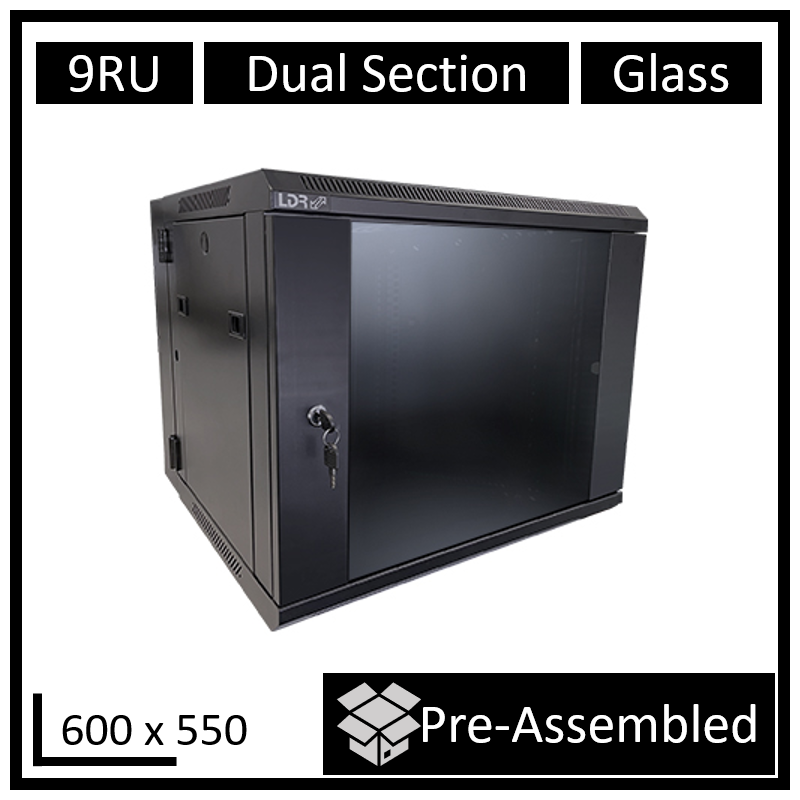 LDR Assembled 9U Hinged Wall Mount Cabinet (600mm x 550mm) Glass Door - Black Metal Construction - Top Fan Vents - Side Acces